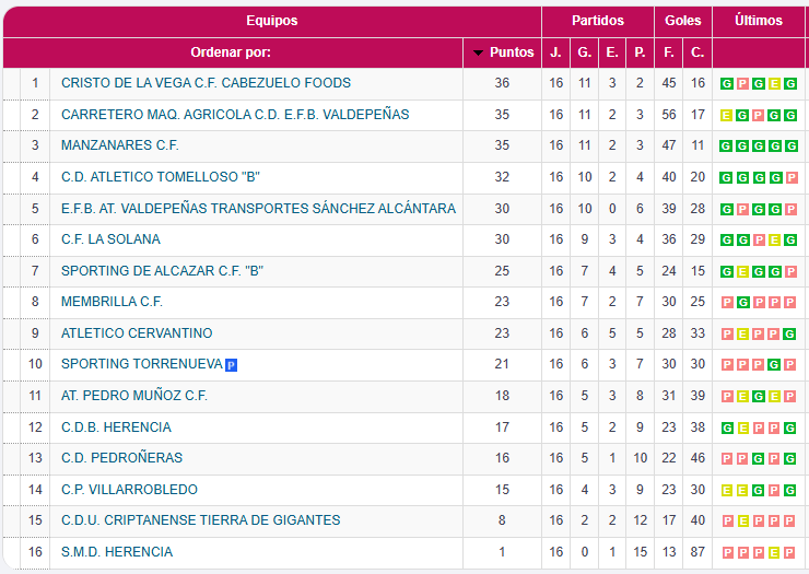 La clasificación del grupo está liderada por el Cristo de la Vega CF de Socuéllamos con 36 puntos, seguido por CDEFB Valdepeñas y Manzanares, ambos con 35, mientras que Tomelloso “B” es cuarto con 32. Precisamente, el conjunto tomellosero será el próximo rival del Juvenil B en la jornada 17, segunda de la segunda vuelta en el Grupo 3 de la Liga Juvenil Territorial.